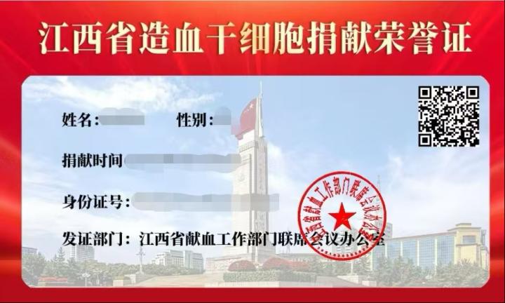 “江西省造血干细胞捐献荣誉证”样式: