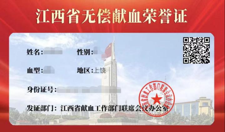 “江西省无偿献血荣誉证”样式: