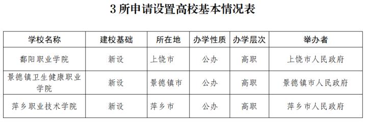 根据《中华人民共和国高等教育法》《普通高等学校设置暂行条例》《高等职业学校设置标准(暂行)》以及《江西省“十四五”时期高等学校设置规划》等有关规定,经第四届江西省高校设置评议委员会专家考察和评议,新设鄱阳职业学院、新设景德镇卫生健康职业学院和新设萍乡职业技术学院获得通过,现将学校相关信息向社会公示。