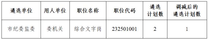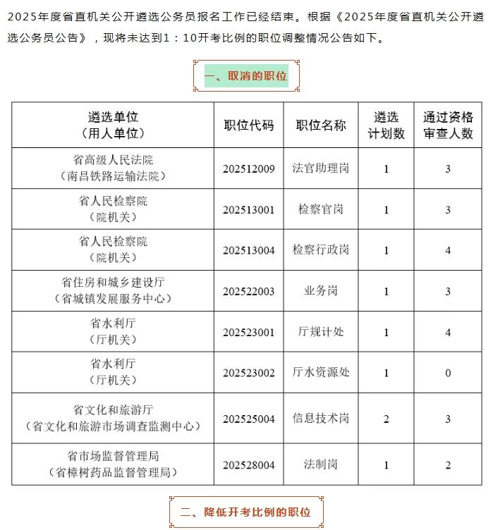 根据《2025年度上饶市市直机关公开遴选公务员公告》规定,经现场报名及资格审查,现对未达到开考比例的职位调减计划公告如下: