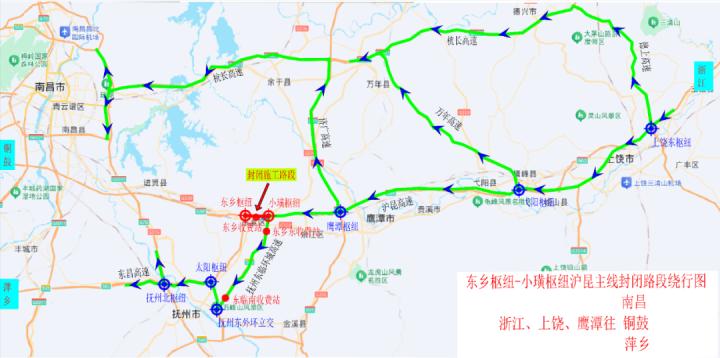 鹰潭通往萍乡、铜鼓方向车辆:沪昆高速→小璜枢纽→抚州东临环城高速→抚州东外环立交→抚州东外环→太阳枢纽→东昌高速→抚州北枢纽→福银高速通往萍乡、铜鼓、南昌。