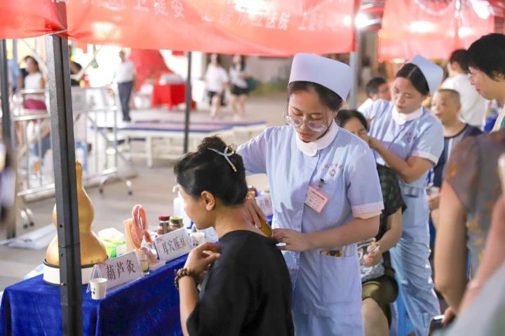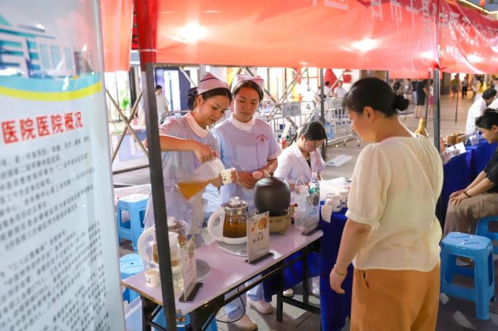中医特色疗法体验区更是“圈粉无数”,医院特意为居民们带来了刮痧、拔罐等体验服务,除此外还带来了消脂茶、润润茶、护肝茶等中药茶饮免费给市民品尝。刚体验完拔罐的王先生说:“最近天气太热了,凉的东西吃得也比较多,今天正好来水南街逛街看到有中医体验,就特意过来感受下。”