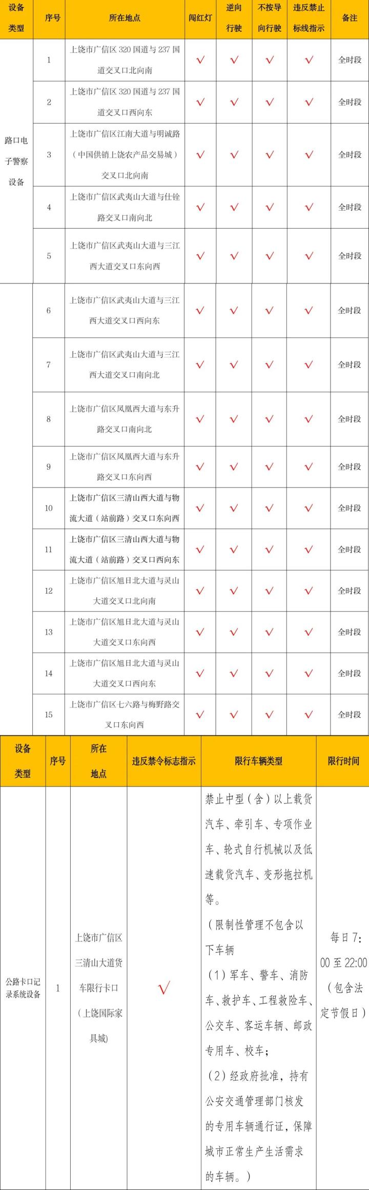 为保障群众出行安全和道路交通畅通,预防和减少道路交通事故发生,全力营造良好的道路交通安全环境,依据《中华人民共和国道路交通安全法》《中华人民共和国道路交通安全法实施条例》《江西省实施<中华人民共和国道路交通安全法>办法》等相关法律法规,将于2025年9月30日零时起,在广信区范围内启用一批交通技术监控设备。现将具体信息公告如下: