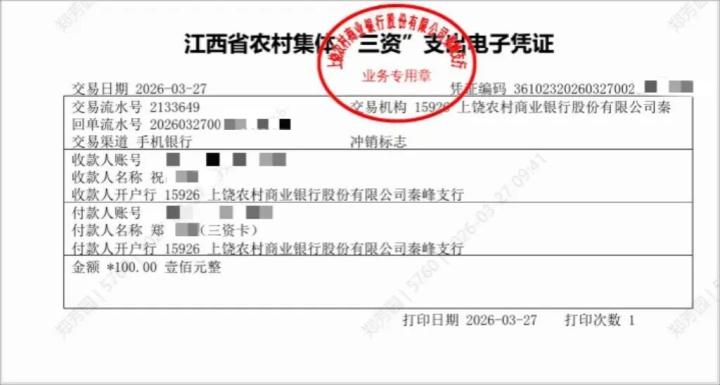 3月27日,信州区秦峰镇老坞村成功通过农村集体“三资卡”完成第一笔村级公务小额支出支付,同步生成上饶市首张农村集体“三资”支出电子凭证。这标志着信州区农村集体“三资”管理试点工作取得突破性进展,上饶市村级小额支出管理正式迈入数字化、规范化新阶段。