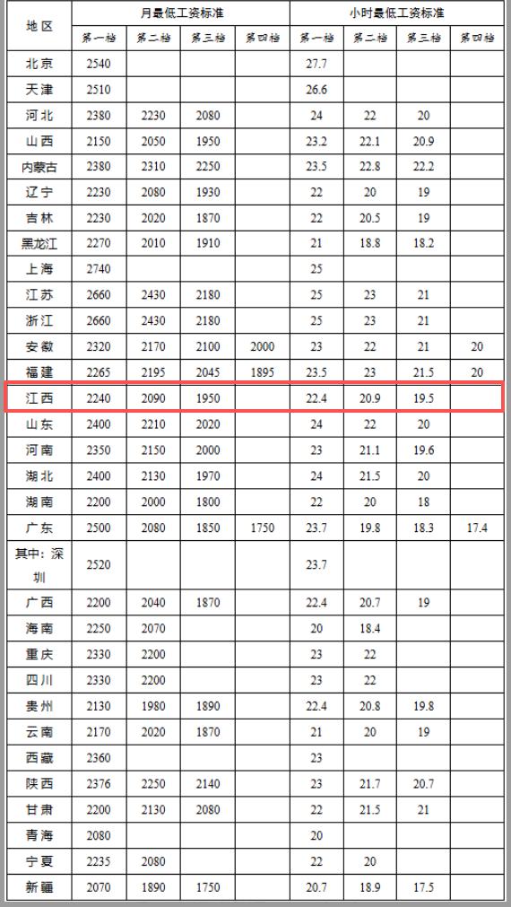 其中,江西第一档月最低工资标准为2240元,第一档小时最低工资标准为22.4元。
