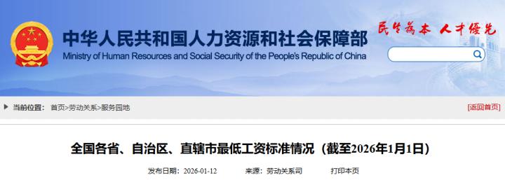 1月12日,人社部官网公布全国各省、自治区、直辖市最低工资标准情况(截至2026年1月1日)。