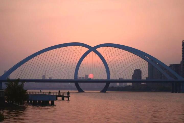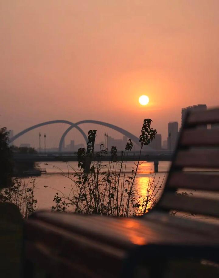 初冬的夕阳为黄昏镀上一层柔光,傍晚时分,天色渐次晕染成暖粉调,落日像一枚被精心安放的光斑,恰好嵌在旭日大桥的双拱之间,衬得桥身线条愈发柔和。江风带着恰到好处的清爽拂过脸颊,毫无凛冽,只余水汽的沁润;信江水面泛着细碎暖光,连桥身的吊杆都在暮色中化作柔美的点缀。站在沿河步道上随手一拍,城市建筑的利落与信江傍晚的烟火气便一同定格,每一帧都写满生活的诗意。