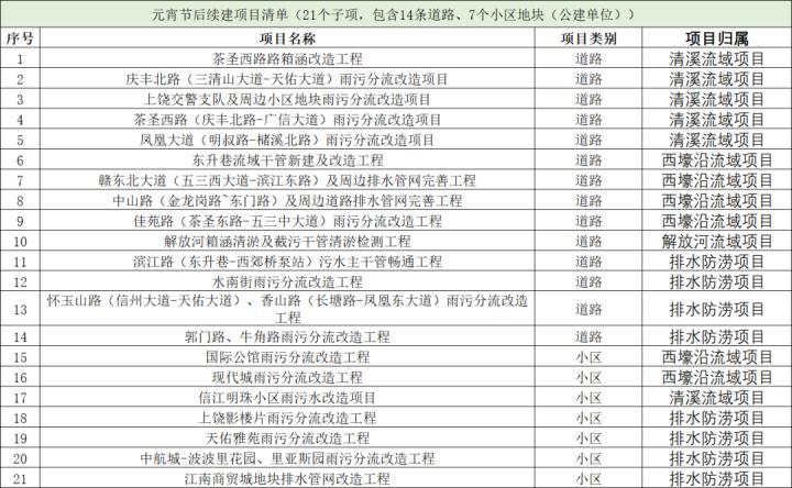 本次新开工项目共47个子项,涵盖清溪排涝通道、上饶大道等13条道路雨污分流改造,锦路花园、大信花园等34个小区及市体育中心等公建单位管网改造,涉及清溪流域、西壕沿流域等多个片区。21个续建项目将全面复工,包含茶圣西路、滨江路等14条道路及现代城、信江明珠等7个小区地块的治理工程,水南街、郭门路等此前跨年度施工项目也将继续推进。