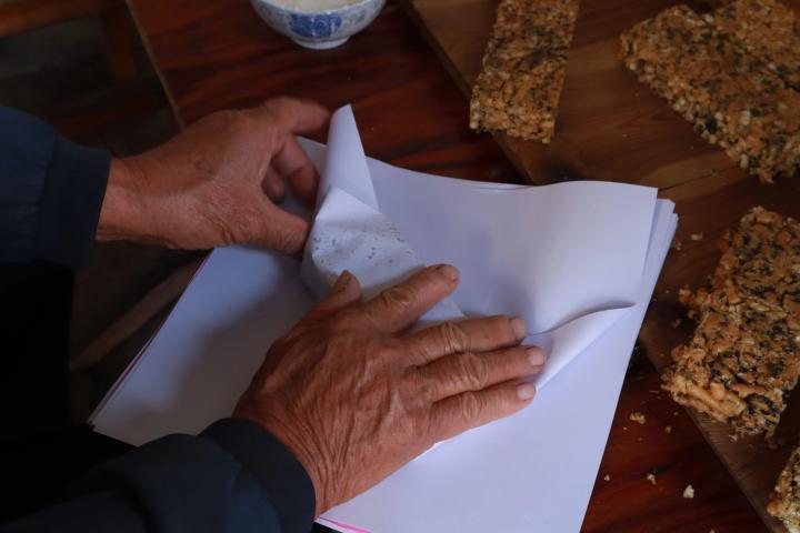 村民王冬香的家庭作坊早已烟火升腾。她正按照祖辈传下的手艺,将油炸过的糯米与滚烫的糖浆一同入锅翻炒。“熬糖是关键,火候太过会有焦苦味,火候不足没法将炒料拌匀,得盯着糖丝拉到刚好可以一块一块从锅勺掉落。”王冬香一边说着,一边将熔化的糖浆与米花、芝麻快速拌匀,趁热倒入木质模具中压实,再用刀按木条宽度切成长条,封装进包装纸里。刚出炉的米焦香甜松脆,落口消融,引得围观的孩子们直咽口水。