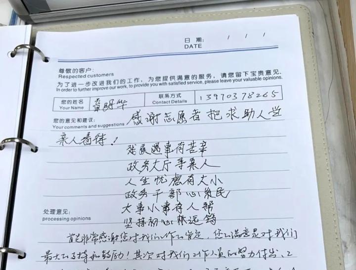 事情办完已是正午11点,两位老人却不肯走。章明华打着手语说要做一面大旗子送给林远筠,林远筠哭笑不得:“那太夸张了,都是该做的事。”两个老人要来感谢簿,拿出随身携带的纸,思索一会,打起草稿,又工工整整地誊写在簿里。绝大部分人写留言时是满意且干脆的,林远筠很少看见这样的慎重与不舍。在56字的留言里,章明华写道:人生忧虑有大小,政务干部心系民;大事小事有人帮,坚持初心林远筠。妻子在另一页写下:在家千日好,出门半朝难;人生有依靠,政府解民悬。