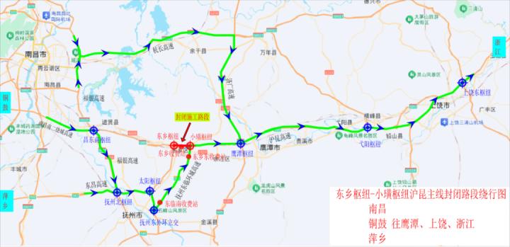鹰潭通往萍乡、铜鼓方向车辆:沪昆高速→小璜枢纽→抚州东临环城高速→抚州东外环立交→抚州东外环→太阳枢纽→东昌高速→抚州北枢纽→福银高速通往萍乡、铜鼓、南昌。