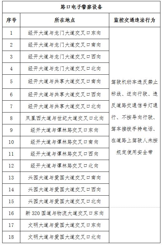 为保障群众出行安全和道路交通畅通,预防和减少道路交通事故发生,全力营造良好的道路交通环境,依据《中华人民共和国道路交通安全法》《中华人民共和国道路交通安全法实施条例》《江西省实施<中华人民共和国道路交通安全法>办法》等相关法律法规,将于2025年10月23日零时起,在上饶经济技术开发区范围启用一批交通技术监控设备。现将具体信息公告如下: