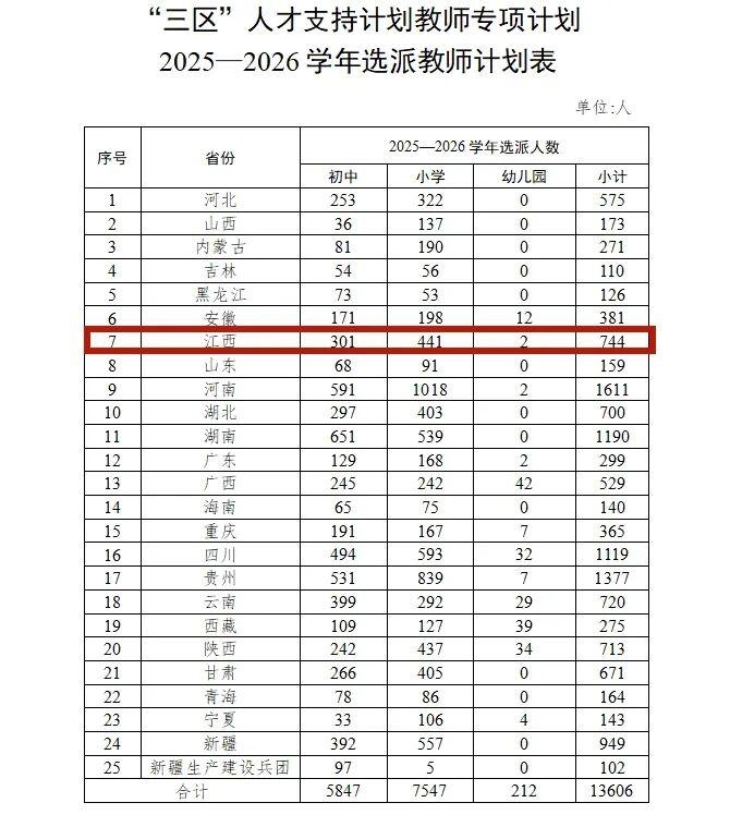 近日,教育部、财政部近日联合印发《关于做好2025年“三区”人才支持计划教师专项计划有关实施工作的通知》(以下简称《通知》)。按照通知,2025—2026学年度全国计划选派13606名教师到“三区”(边远贫困地区、边疆民族地区和革命老区)支教,其中江西计划选派744名教师(初中301名、小学441名、幼儿园2名)。