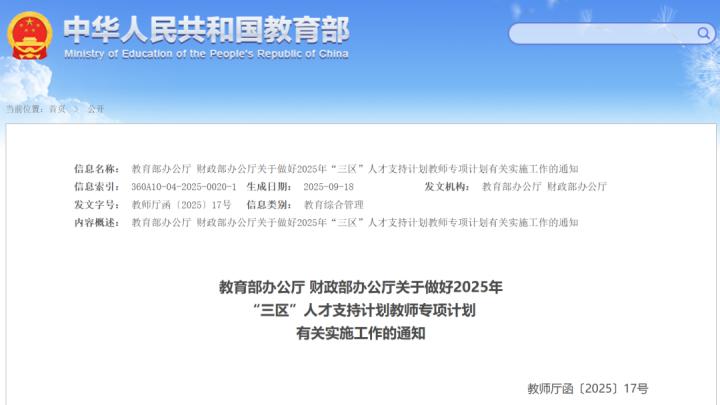 近日,中华人民共和国教育部网站发布教育部办公厅 财政部办公厅关于做好2025年“三区”人才支持计划教师专项计划有关实施工作的通知,按照通知,江西计划选派744名教师(初中301名、小学441名、幼儿园2名)到“三区”(边远贫困地区、边疆民族地区和革命老区)支教。