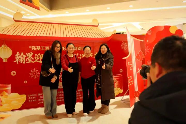 另一边,由信州区摄影家协会设置的“公益全家福”拍摄点同样温馨满满。红色的背景、喜庆的灯笼、可爱的生肖道具,吸引了不少家庭驻足。摄影师耐心地引导着一家三代调整姿势,“来,看镜头,笑一笑!”随着快门声响起,团圆的笑脸被瞬间定格。
