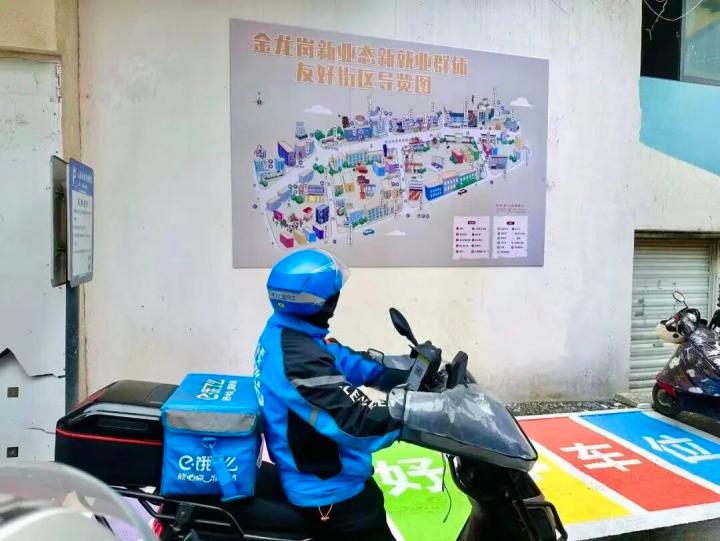 进入街区,就看到入口处张贴着清晰的“友好地图”。地图上详细标注了商家位置、友好车位、休息区、卫生间等,让他能够快速地规划路线。“以前单子多了规划路线还是挺费脑的,现在一目了然,省时又省心!”小李赞叹道,走进暖“新”驿站,喝上了免费热水,用充电器给手机充了电,还顺便用微波炉热了热自带的晚饭。“感觉像有了个临时小家。”小李笑着说。