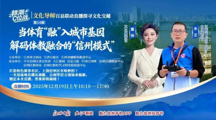 12月19日上午,赣潮C位战|文化导师百县联动直播将走进上饶市信州区,与您一起深入探访信州区如何通过“体教融合”打造独具魅力的赛事名区。我们将跟随新闻导师朱正与主持人董洋,双线穿梭于室内舞台与信江河畔公园,直击体育、武术等校园特色项目的活力展示,感受赛艇、击剑等专业队伍的精彩表演与深度访谈,解读信州以赛促教、培育品牌赛事、赋能城市发展的战略蓝图,全景展现一座城市如何用体育点燃青春、用赛事塑造名片。