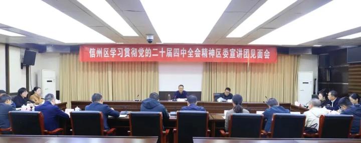 潘表光指出,党的二十届四中全会,是在向第二个百年奋斗目标进军的新征程上召开的一次具有全局性、历史性意义的重要会议。学习好、宣传好、贯彻好党的二十届四中全会精神,是当前和今后一个时期全区上下的一项重大政治任务。作为区委宣讲团成员,要深刻认识肩负着区委的信任和重托,责任重大、使命光荣,反复深入学习领会全会精神,通过深入宣讲,推动全会精神直达基层、直面群众,确保党中央决策部署在信州落地生根。