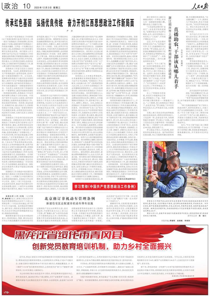 坚持把以人为本理念贯彻始终,分类施策做好各领域思想政治工作。习近平总书记强调,“思想政治工作从根本上说是做人的工作”。《条例》把坚持人民立场、以人为本作为思想政治工作必须遵循的重要原则之一,并结合各领域实际,分别对相关思想政治工作的目标任务作出规定。我们将牢固树立人心是最大的政治的理念,精准把握不同社会群体的思想动态和心理特点,分类施策做好思想政治工作,更好地引导人、感召人、凝聚人、塑造人。比如,加强企业思想政治工作是新时代企业现代化的内在要求。我们将发扬“红色工运”的光荣传统,结合企业生产经营管理开展思想政治工作,加强国有企业领导人员党性教育、宗旨教育、警示教育,健全民营经济人士思想政治引领机制,深化“中国梦·劳动美”主题宣传教育,更好团结凝聚职工群众、增强企业内生动力和创新活力。乡村全面振兴,既要塑形,又要铸魂。我们将切实加强农村思想道德建设,深入实施文明乡风建设工程,深化移风易俗乡风文明专项行动,综合治理高额彩礼、薄养厚葬等,全面提升农民群众精神风貌。培养什么人的问题是教育的首要问题。我们将聚焦立德树人根本任务,持续深化“大思政课”综合改革试验区建设,加快构建“课堂+实践+网络”的立体化育人体系,推进大中小学思想政治教育一体化建设,推动全员、全程、全方位育人。新经济组织、新社会组织、新就业群体规模持续扩大,从业人员多、渗透力强。我们将结合新兴领域党的建设和群团工作,运用社会化、群众化、网络化方式,开展有针对性的学习教育;坚持把解决思想问题与解决实际困难结合起来,加快完善社会工作联络员制度,分行业、分领域建立社会工作联系点,深入掌握各群体动态和诉求,做好思想政治引领和关爱服务工作,不断增强党在新兴领域的号召力凝聚力影响力。