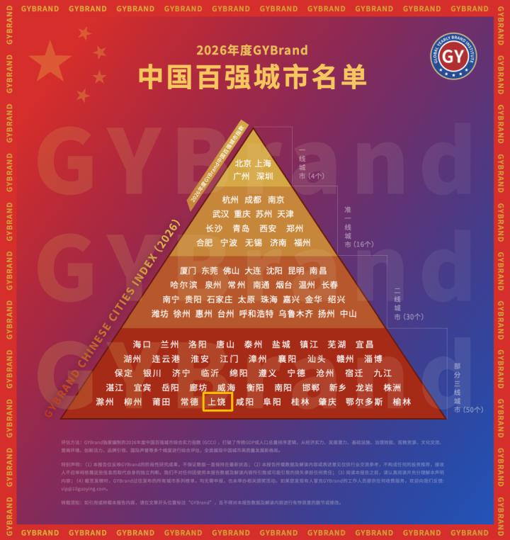 3月5日,城市指数研究机构GYBrand独家编制的《2026年度中国百强城市指数》正式发布。其中,上饶上榜2026年度GYBrand中国百强城市名单,位列第94位,较2025年前进5个位次,城市综合实力再上新台阶。