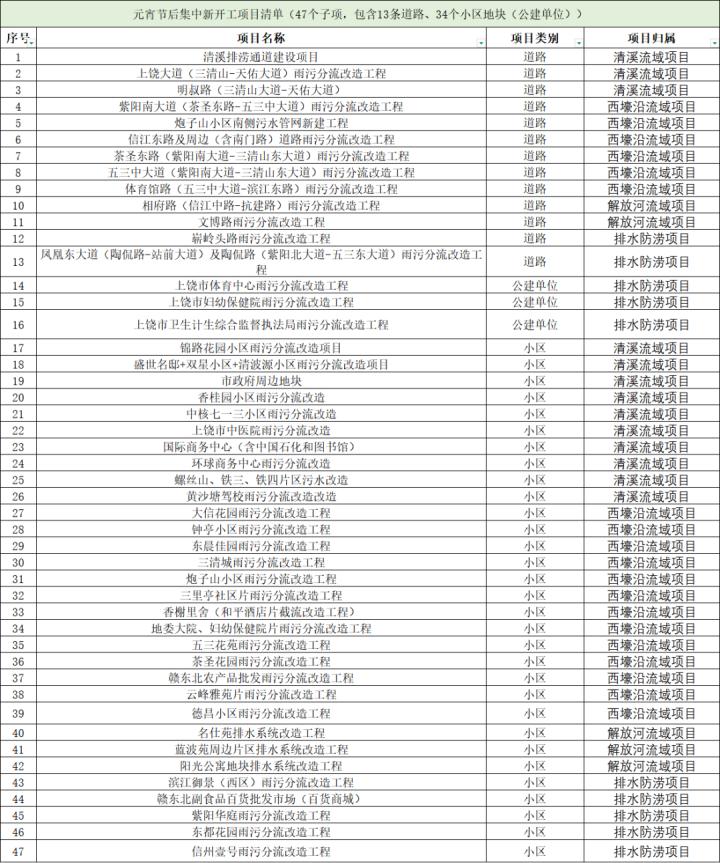 本次新开工项目共47个子项,涵盖清溪排涝通道、上饶大道等13条道路雨污分流改造,锦路花园、大信花园等34个小区及市体育中心等公建单位管网改造,涉及清溪流域、西壕沿流域等多个片区。21个续建项目将全面复工,包含茶圣西路、滨江路等14条道路及现代城、信江明珠等7个小区地块的治理工程,水南街、郭门路等此前跨年度施工项目也将继续推进。