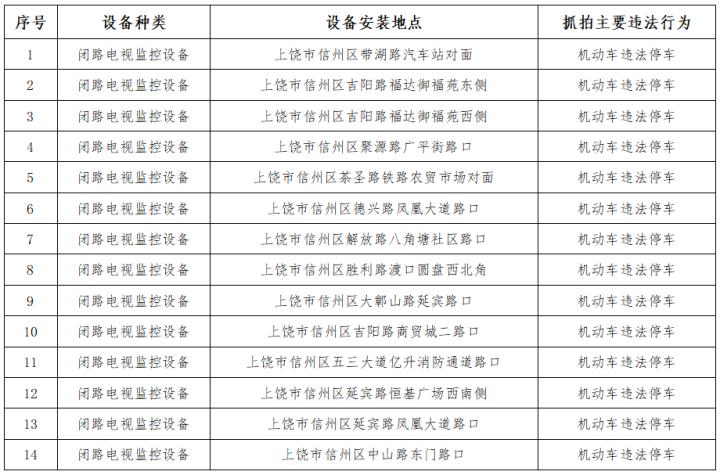 为保障道路交通畅通和群众出行安全,预防和减少道路交通事故发生,全力营造良好的道路交通环境,依据《中华人民共和国道路交通安全法》《中华人民共和国道路交通安全法实施条例》《江西省实施<中华人民共和国道路交通安全法>办法》等相关法律法规,将于2026年2月14日零时起,在上饶市信州区范围内启用一批交通技术监控设备,现将具体信息公告如下: