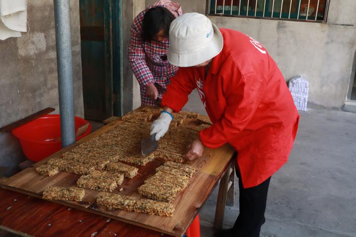 村民王冬香的家庭作坊早已烟火升腾。她正按照祖辈传下的手艺,将油炸过的糯米与滚烫的糖浆一同入锅翻炒。“熬糖是关键,火候太过会有焦苦味,火候不足没法将炒料拌匀,得盯着糖丝拉到刚好可以一块一块从锅勺掉落。”王冬香一边说着,一边将熔化的糖浆与米花、芝麻快速拌匀,趁热倒入木质模具中压实,再用刀按木条宽度切成长条,封装进包装纸里。刚出炉的米焦香甜松脆,落口消融,引得围观的孩子们直咽口水。